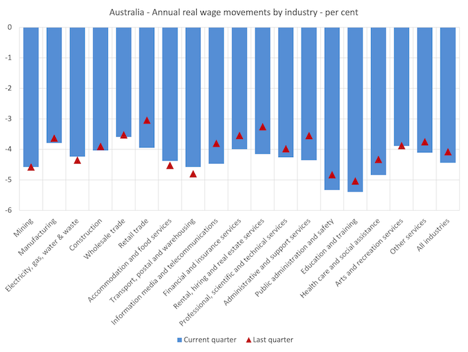 While nominal wages growth was positive, albeit modest, the next graph shows the movements in real wages across industries and you can see that real wages continued to fall in all sectors.