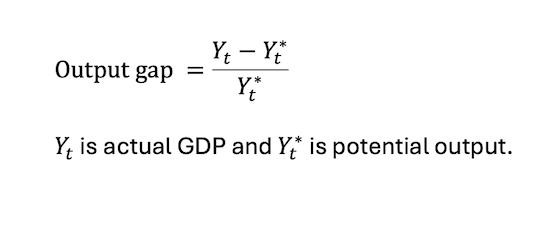 Output gap = (100 – 120)/120 = -0.166666667 or in percentage terms -16.7 per cent.