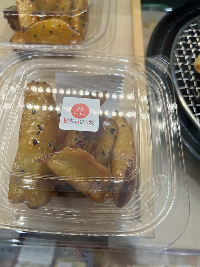 I avoid these places mostly, but the food hall is an extravaganza and you can get this sweet potato glazed in black sesame for a few dollars (335 yen).