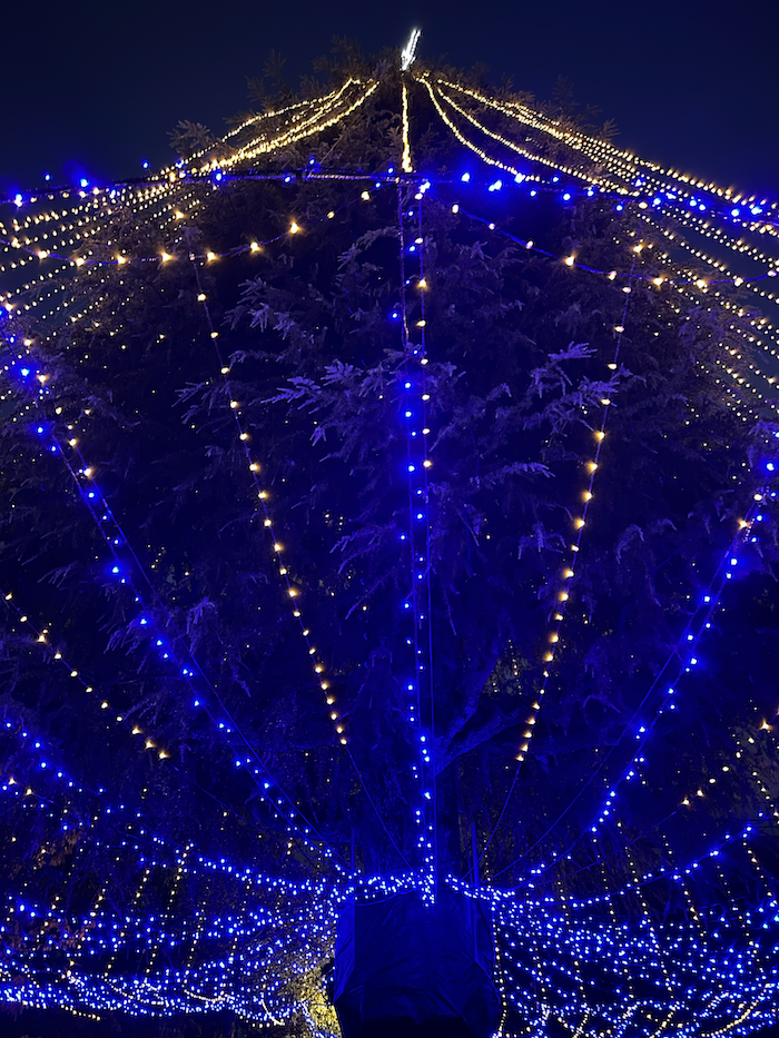 Basically, they have a structure of netting over the manicured tree which supports the lights and are largely invisible during the daylight hours.