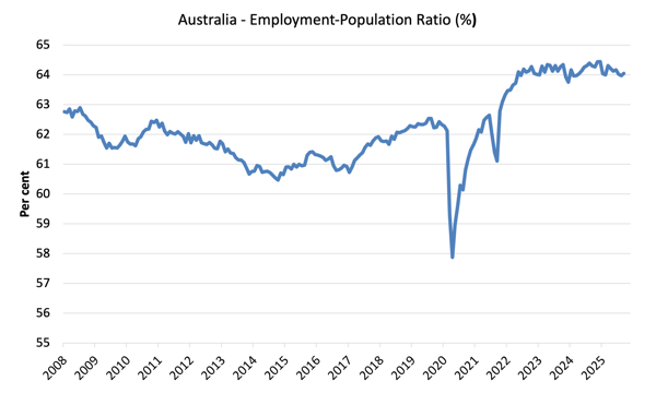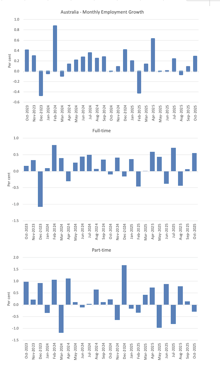 For the last two months, the Australian labour market has gone backwards. The deterioration seems to have stabilised in October. The Australian Bureau of Statistics (ABS) released the latest labour force data today (November 13, 2025) – Labour Force, Australia – for October 2025, which reveals a slight drop in official unemployment and underemployment and a stable employment to population ratio – marking time. The best sign this month is that full-time employment growth was relatively strong. However, there are now 10 per cent of available labour not being used in one form or another, so it is ludicrous to talk about Australia being close to full employment. There is substantial scope for more job creation given the slack that is present.