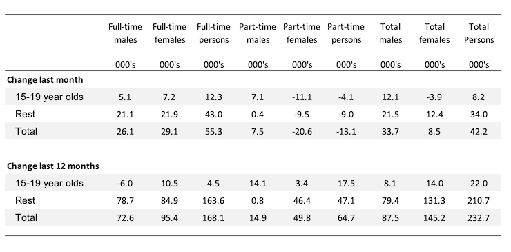 The following table summarises the shifts in the teenage labour market for the month and over the last 12 months.
