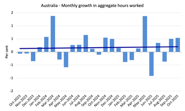 Monthly hours worked rose 10.7 million (0.54 per cent) in October 2025