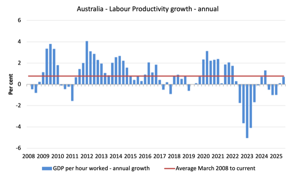 To see the above graph from a different perspective, the next graph shows the annual growth in GDP per hour worked (labour productivity) from the beginning of 2008 to the September-quarter 2025.