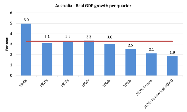 Although COVID severely interrupted the economy, once we take out the quarters between March 2020 and March 2022 (inclusive), then the average since 2020 has been 1.9 per cent per annum – very mediocre.
