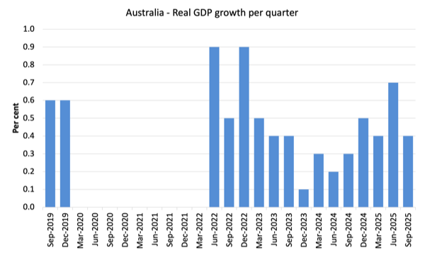The Australian economy grew by 0.4 per cent in the September-quarter 2025 (down from 0.6 per cent) and by 2,1 per cent (up from 1.8) over the 12 months.