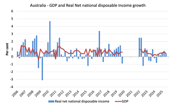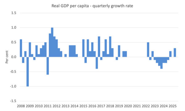 In the September-quarter 2025, GDP per capita grew by zero per cent (the red arrow marks the spot!) – thus, real GDP growth matched the population growth.