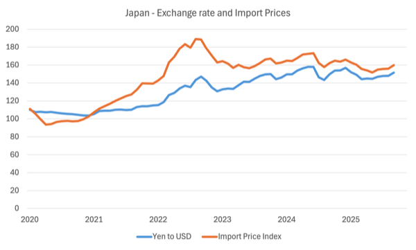 The following graph shows the evolution of the yen parity and import prices (base year 2020 = 100) in Japan from 1980 to October 2025.