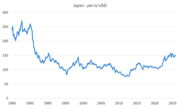 The following graph shows the monthly movement in the yen against the USD from 1980 to October 2025.