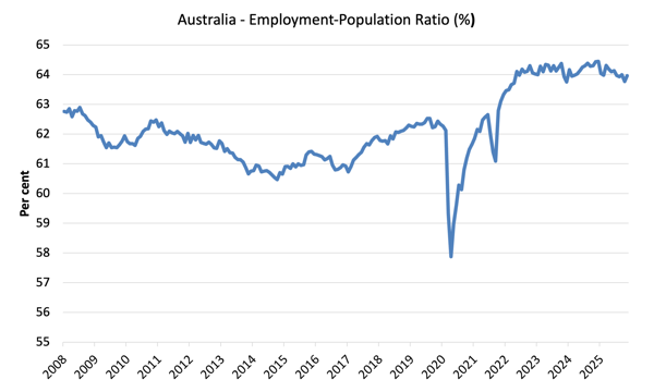 The following graph shows the Employment-Population ratio fell 0.2 points to 63.8 per cent, the lowest it has been since January 2024.