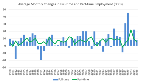 The next graphs show the average monthly change in total employment (first graph) and full- and part-time employment (second graph).