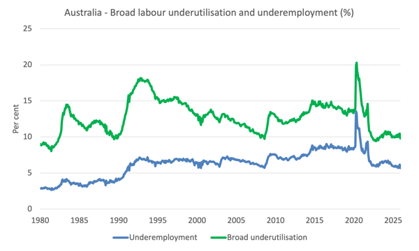 The following graph shows the evolution of underemployment and the Broad labour underutilisation rate since 1980.