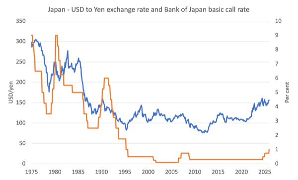 In January 2012, the USD/yen parity stood at 76.3 and by December 2025, the value was 155.9, a depreciation of 104 per cent.