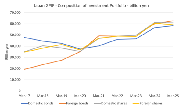 The GPIF has shifted its investment portfolio significantly towards foreign bonds and shares over this time (the trend started post 2010).