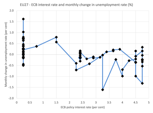 Here is another graph that tracks the ECB policy rate and the monthly change in the unemployment rate from December 2021, when the inflation period began and January 2026.