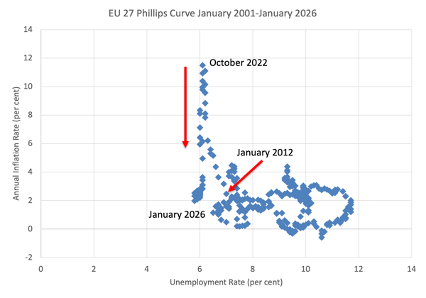 First, please examine the following graphs which is a Phillips curve from the EU27 from January 2001 to January 2026, using monthly data.