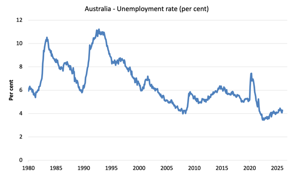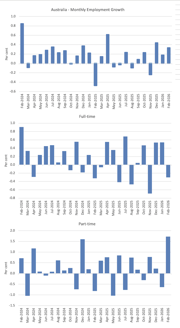 The Australian Bureau of Statistics (ABS) released the latest labour force data today (March 19, 2026) – Labour Force, Australia – for February 2026 – which showed that the labour market had gone backwards. While employment growth remained positive, full-time work fell. The participation rate rose, which in some situations indicates a positive outlook as workers re-enter the labour market to take advantage of the increased employment opportunities. In this case, I think it signals more desperation as cost-of-living pressures rise, given that a lot of older workers came back into the labour market looking for work. Unemployment rose sharply (0.2 points) to 4.3 per cent. Together with underemployment, there are now 10.1 per cent of available labour not being used it is ludicrous to talk about Australia being close to full employment. There is substantial scope for more job creation given the slack that is present. The RBA’s claim that there is significant excess demand in the overall economy, which they used on Tuesday to justify a further rate hike, is hard to reconcile against this data.