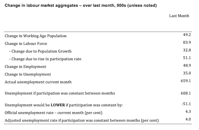 - The rise in the participation rate meant that there were 51.1 thousand MORE workers in the labour force (relative to what would have occurred had the participation rate remained unchanged).