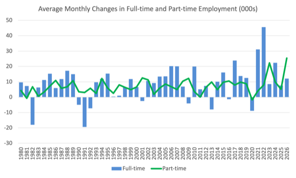 - While employment growth remained positive, full-time work fell.