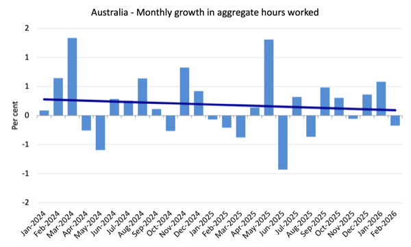 Monthly hours worked fell 3.5 million (-0.17 per cent) in February 2026