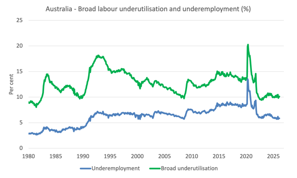 The following graph shows the evolution of underemployment and the Broad labour underutilisation rate since 1980.