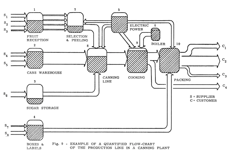 This flow-chart appears on Page 112 of his chapter and describes the production line of a fruit and vegetable canning factory, that they were integrating into Cybersyn.