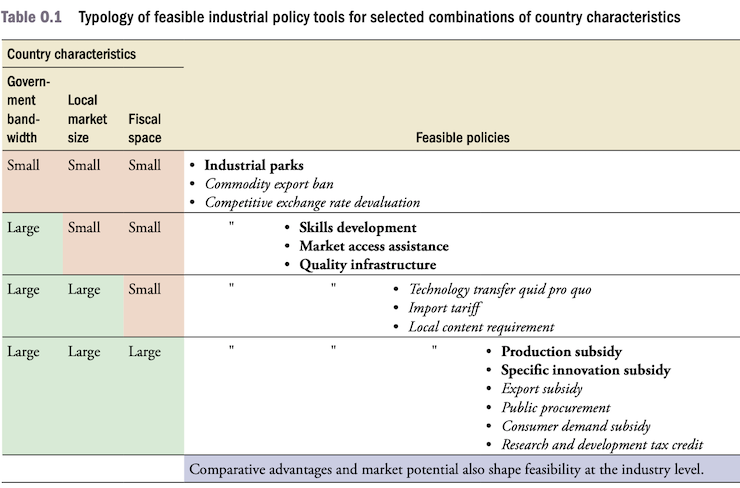 The Report provides this Table (Table 0.1) which matches the types of industrial policy tools that are useful depending on the characteristics of the country.