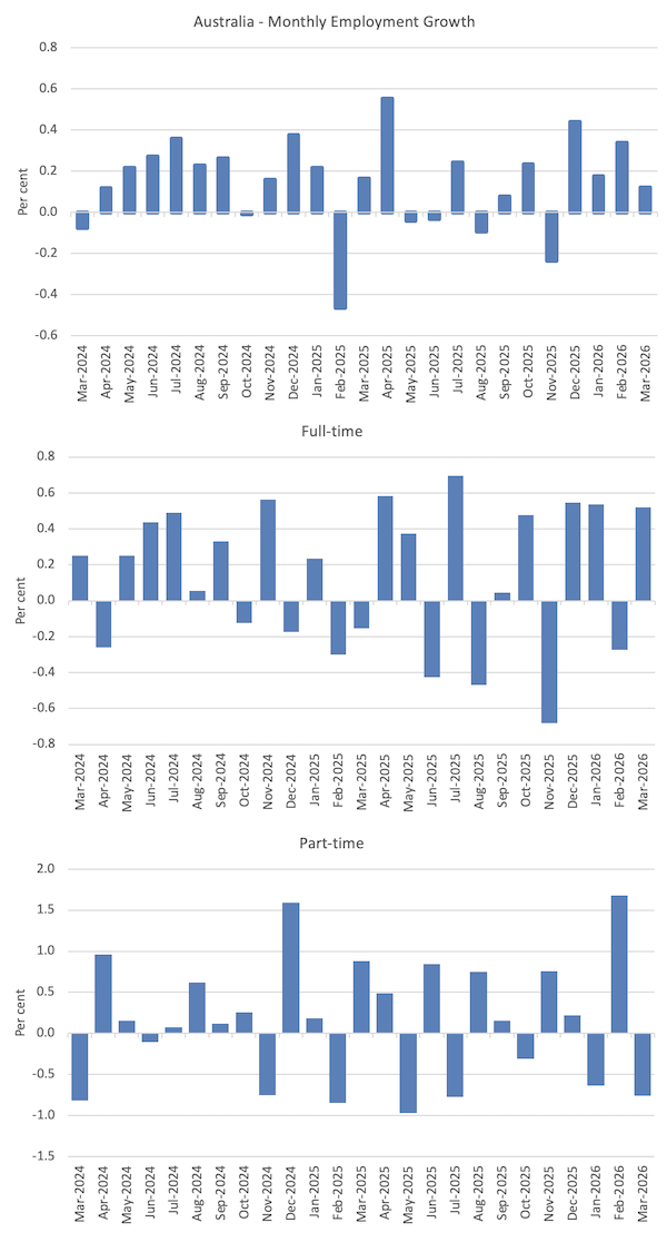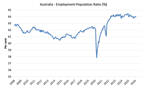 The Australian Bureau of Statistics (ABS) released the latest labour force data today (APRIL 16, 2026) – Labour Force, Australia – for March 2026 – which showed that the labour market steadied after last month’ contraction. While employment growth remained positive and was dominated by full-time work gains (as part-time employment fell), the fact that the participation rate fell helped keep the unemployment rate stable. There are now 10.1 per cent of available labour not being used (either unemployed or underemployment), which makes a farce of the RBA’s claims that the labour market is tight. There is substantial scope for more job creation given the slack that is present. However, if the global situation doesn’t improve quickly then that slack will increase sharply.