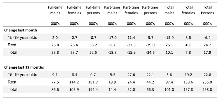The following table summarises the shifts in the teenage labour market for the month and over the last 12 months.