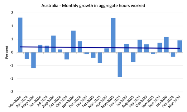 Monthly hours worked rose 9.2 million (0.46 per cent) in March 2026